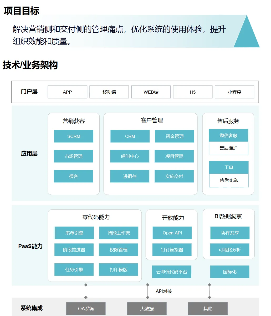 这张图清晰展示了某数字安全企业的全链路平台架构,从门户层的APP、小程序到应用层的CRM、BI数据洞察,再到PaaS层的低代码能力,形成完整闭环。核心是打破销售、行销、交付三大组织的信息壁垒,让数据互通、流程协同,这也是其销售效率提升50%的关键。