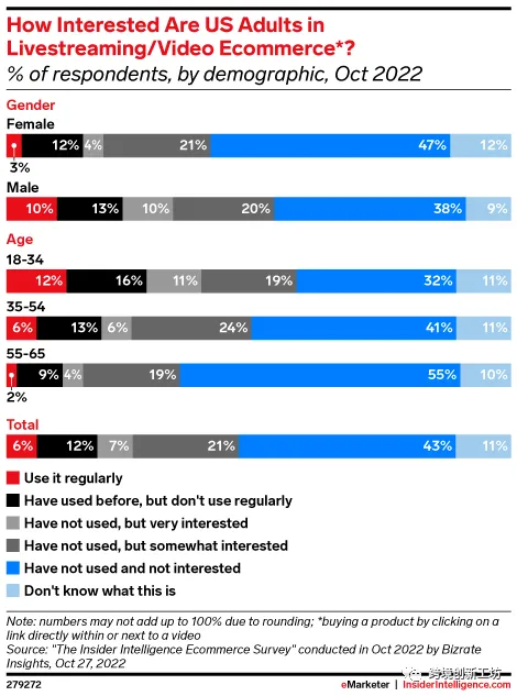 到目前为止,这种形式还没有流行起来:Insider Intelligence和Bizrate Insights于2022年10月进行的一项调查发现,只有18%的美国成年人使用过直播购物。相比之下,根据我们的预测,今年中国近40%的互联网用户将通过直播进行购买。