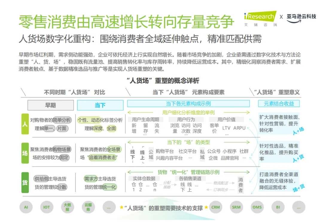 过去,零售消费行业依赖于市场红利实现自然增长。然而,随着市场逐渐饱和,企业需要通过数字化技术重塑“人、货、场”,以稳固流量池、提高销售转化率和降低运营成本。这一过程的核心在于精细化洞察消费者需求、扩展触点和精准选品。