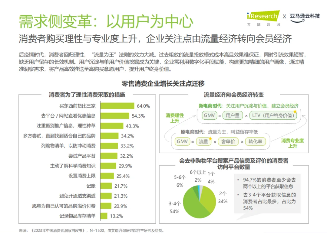 后疫情时代,消费者行为发生了显著变化。理性消费成为主流,消费者更加注重甄别推广信息,理性种草。数据显示,64.0%的消费者在购买前会进行货比三家,54.3%会去平台查看优惠信息。这种行为的转变促使企业从流量经济转向会员经济,更加关注用户沉淀与单用户价值挖掘。