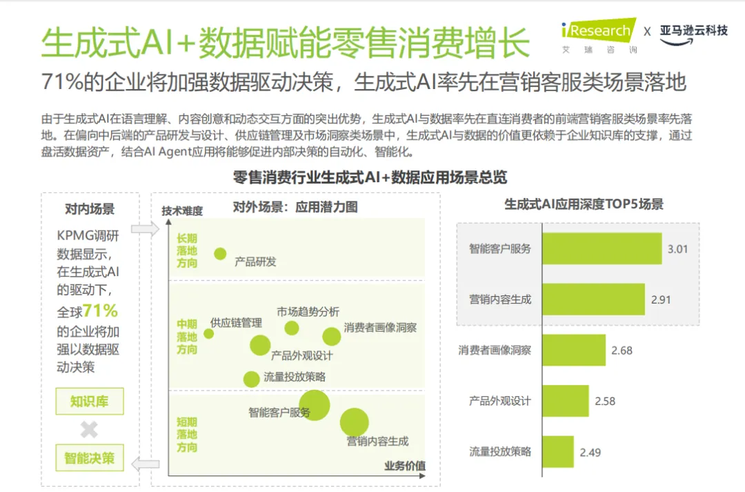 生成式AI与数据率先在营销客服类场景落地,如智能客户服务和营销内容生成。这些场景的落地不仅提升了企业与消费者的互动效率,还通过数据驱动的决策,优化了企业的运营效率。