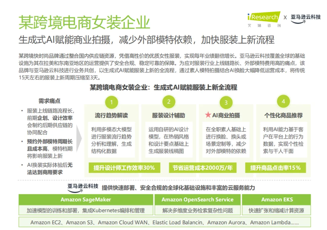 某跨境电商女装企业通过生成式AI赋能服装上新的全流程,将传统15天左右的服装上新周期压缩至3天。通过AI换脸技术,企业不仅降低了运营成本,还提升了商品点击率。