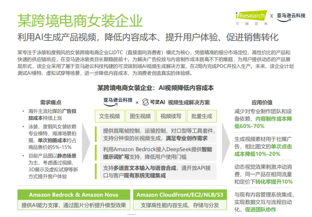 某泳装电商企业采用基于亚马逊云科技构建的AI视频生成解决方案,减少了对专业制作团队和设备的依赖,降低了内容制作成本,提升了用户体验。