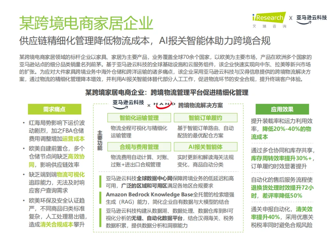 某家居跨境电商企业通过AI报关智能体和物流优化方案,降低了物流成本,提升了供应链效率,确保了跨境业务的低延迟和高可用。