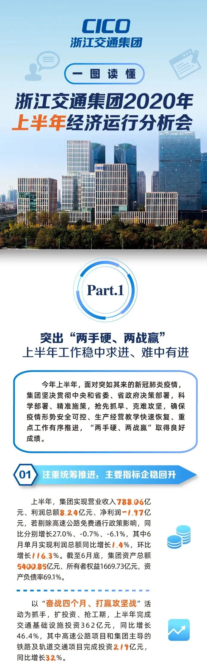 浙江交通集团召开2020年上半年经济运行分析会暨半年度安全生产工作会议,认真贯彻落实省委十四届七次全会和省委书记车俊在集团调研时的重要讲话精神,积极对标建设“重要窗口”的新目标新定位,深入贯彻高水平交通强省建设战略部署,回顾总结上半年工作,研究部署下半年工作,进一步承担好责任、发挥好功能、发展好企业,继续朝着世界一流企业目标加快迈进,努力成为高水平交通强省建设的“硬核”力量。
