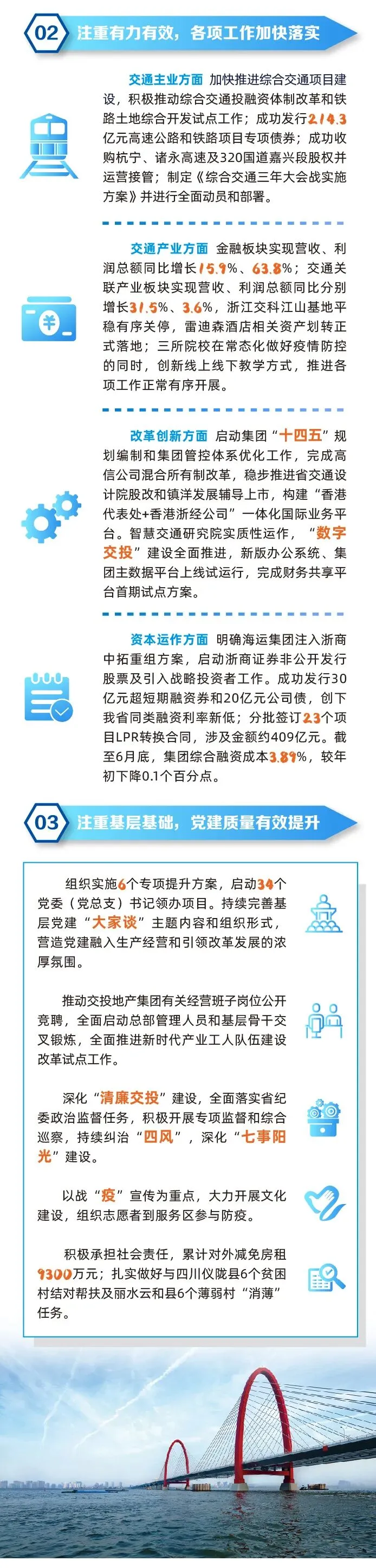 詹小张在工作报告中分析了上半年主要经营情况,总结了上半年生产经营工作的主要成效,提出了当前面临的困难和问题,并部署了下半年七个方面的重点工作:一是确保综合交通三年大会战首年告捷,高标准打造品质工程,高水平建设智慧高速,高效率实施高速公路组织变革,试点将高速公路运营向经营转型。二是加快经营性产业转型升级,做优增量提效益,做实存量稳效益,做深协同增效益。三是以更高层次推进改革,推动治理体系再优化,推动数字化转型再提速,推动激励机制再改革,并确保江山基地员工安置平稳有序。四是更大力度推动资本运作,全力发挥上市平台作用,全力推进股改上市及资产重组和并购,借助资本运作推动国际化提速。五是有效实施创新驱动战略,聚焦聚力智能交通,打造高能创新主体,集聚集成创新要素。六是加强内控等基础管理,进一步加强预算管理,加强风险管控,加强内控管理。七是严字当头抓安全生产,突出抓好“三基”建设,突出抓好交通运营安全,突出抓好应急能力提升。