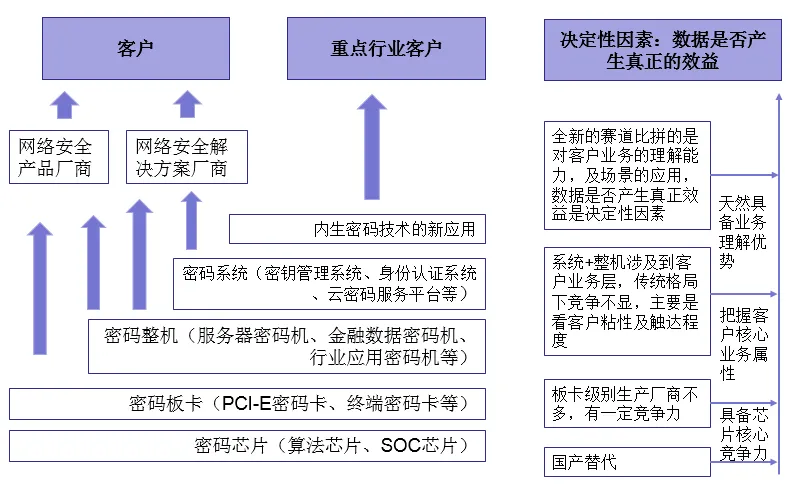 由于商用密码行业需求端主要是大型央企和国企,存在较高的差异化和定制化,产品和密评服务一般需要触达客户端,所以在当前全面开花蓝海市场中,产业链上游和中游的界限进一步模糊化,未来随着行业的持续发展,或呈现强客户粘性优势下的整合趋势。