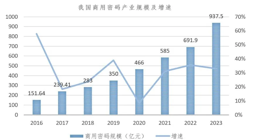 根据赛迪统计数据显示,我国商用密码行业规模不断扩大,2023年有望达937.5亿元,行业复合增速超过30%。