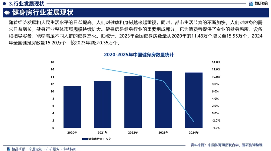 发展规模:随着经济发展和人民生活水平的日益提高,人们对健康和身材越来越重视,健身行业整体市场规模持续扩大。健身房是健身行业的重要组成部分,它为消费者提供了专业的健身场所、设备和指导服务,能够满足不同人群的健身需求。2023年全国健身房数量从2020年的11.48万个增长至15.55万个,2024年全国健身房数量15.20万个,较2023年减少0.35万个。