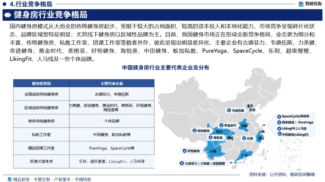 竞争情况:目前,我国健身市场正在形成全新竞争格局,业态更为细分和丰富,传统健身房、私教工作室、团课工作室等数者并存,彼此呈现出明显差异化,主要企业有古德菲力、韦德伍斯、力美健、奇迹健身、黄金时代、美格菲、好恒健身、海悦荟、中田健身、蚁加私教、PureYoga、SpaceCycle、乐刻、超级猩猩、LikingFit、人马线及一些个体品牌。