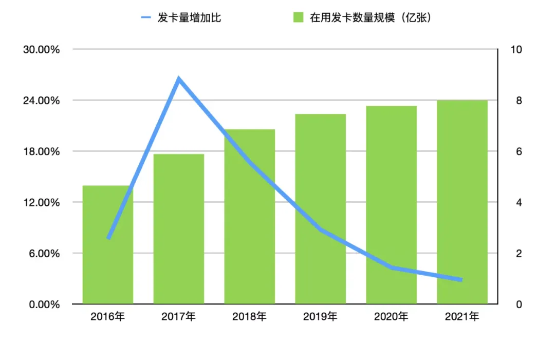 新增卡量对于银行来说是个重头指标,不过随着监管越来越严格,以及「刚性扣减」政策逐渐开始执行;可以想见,银行对于新办卡的客户是又爱又恨,而整体的数据也可以看出增量的放缓。