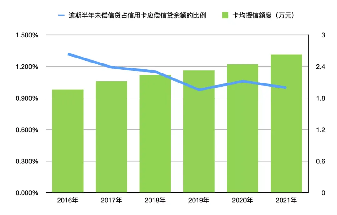 不过与增速放缓相比,卡均授信额度和逾期偿还比例这两个指标倒是都有向好的迹象。首先是卡均授信额度的增长,蓝翼猜测这应该是银行内部针对拓展新户困难这个缺憾,对于「特选」的老用户,进行了一个卡均授信的全面升级。蓝翼猜测,某种程度上这也是挖掘「优质」客户潜力的一个势头。