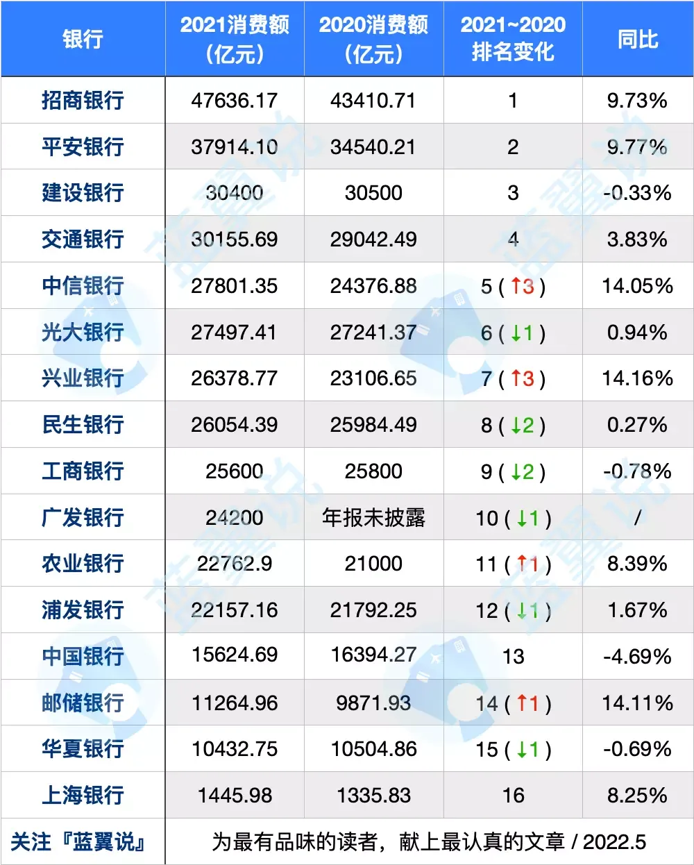 接下来,我们再来看看 2021 年各银行之间的消费额「流水」变化:前四名倒是都没变,但是第五至十二名的变化可谓翻天覆地。