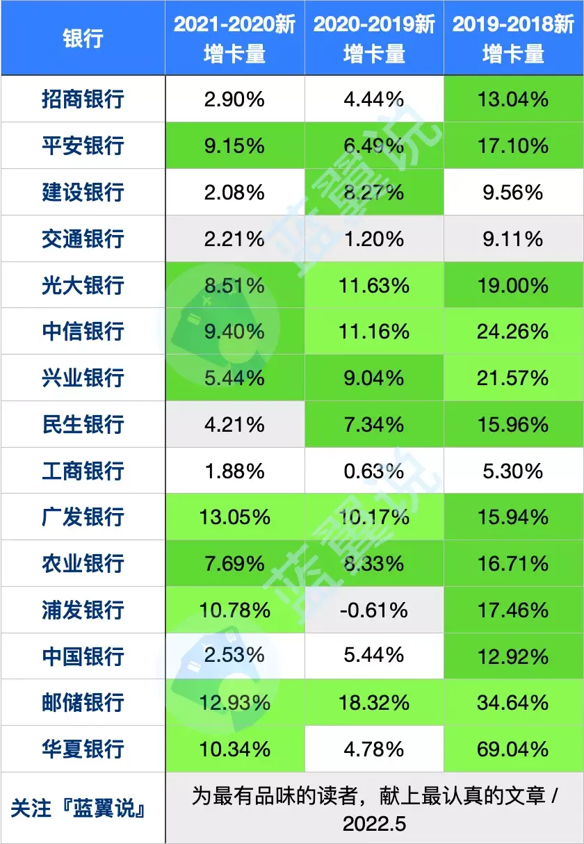 从银行的年报中可以发现,2021~2020 新增卡量比 2020~2019 新增卡量明显要低的多,至于 2019~2018 年呢,那真是一个曾经的黄金时代……蓝翼用浅绿色标出最显著的增长,用深绿色标出明显快于其他银行的增长。可以看出:广发、中信、光大、兴业、农行、平安、邮储这几家银行均取得了较快的增长。