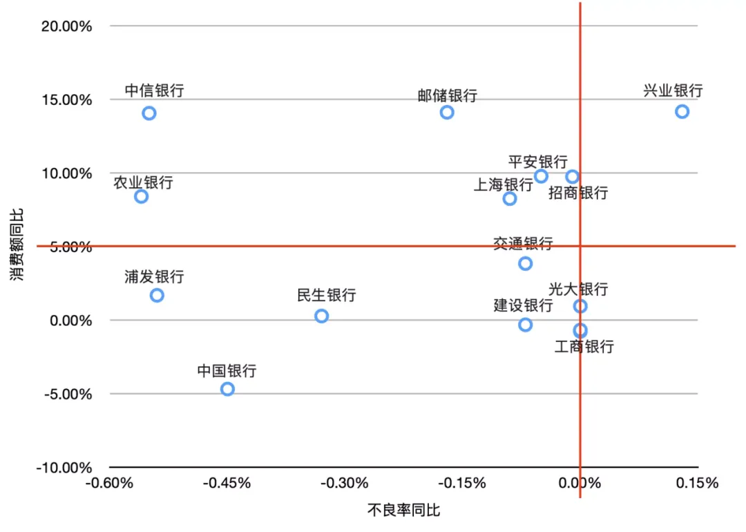 第一象限:不良率的增长情况 > 0,消费额的增长 > 5%。代表银行:兴业银行,增长态势好,在控制不良率的前提下保证有质量的增长用户;不过兴业银行已经是处于历史不良率高点,警惕!