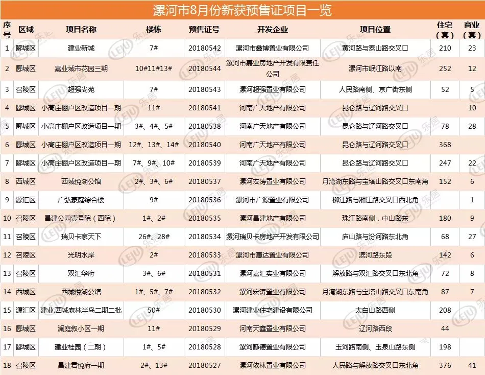 据漯河市住房保障和房屋管理局统计数据显示,8月份漯河市共有14个项目新获18枚预售证,包括2734套住宅及205套商业,总计近三千套房源,8月份也成为本年度拿证房源最多的月份。本月拿证的楼盘源汇区、郾城区、召陵区、西城区均有分布。