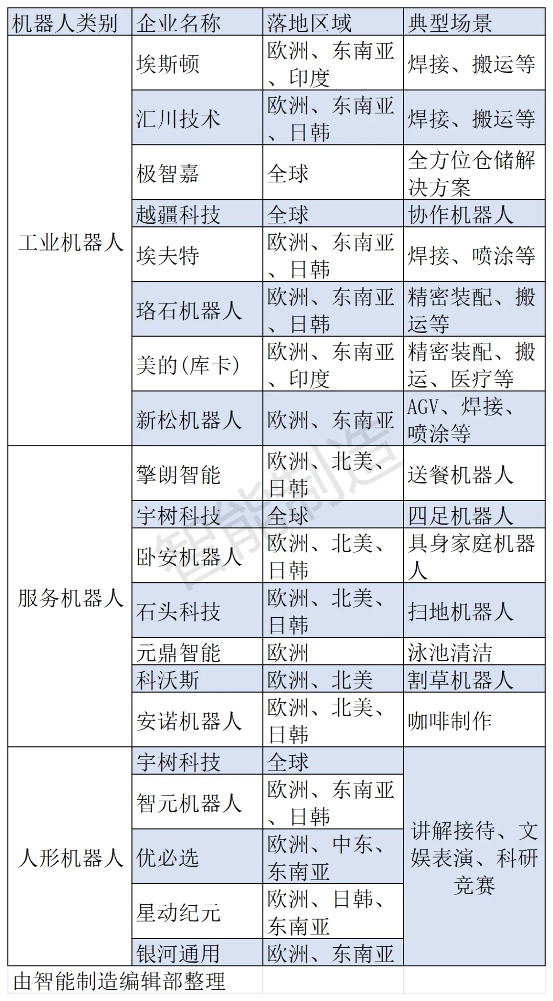 表2 中国机器人代表性企业落地区域与场景整理