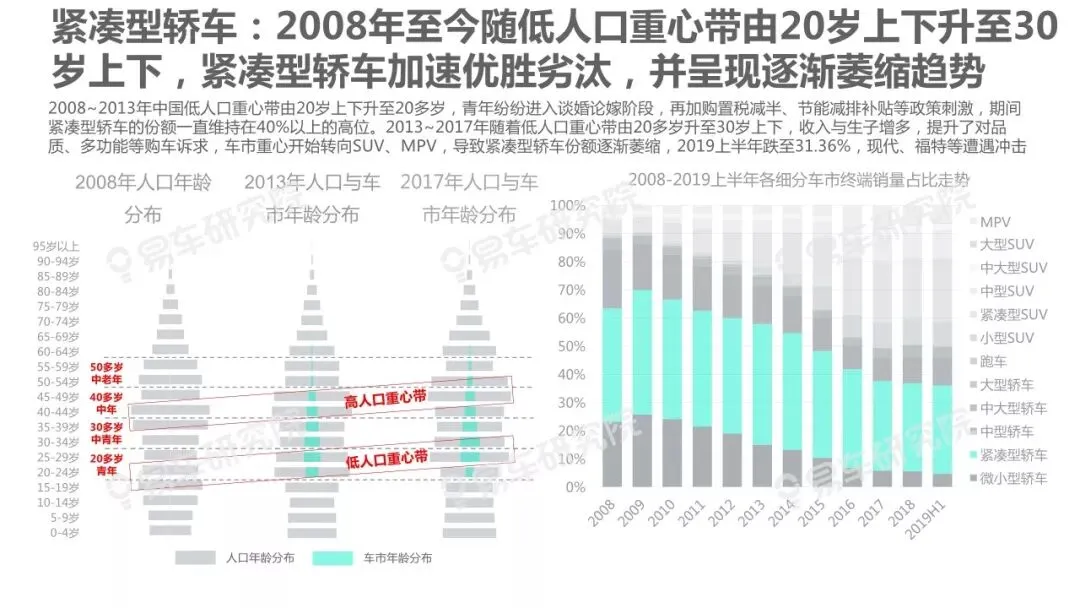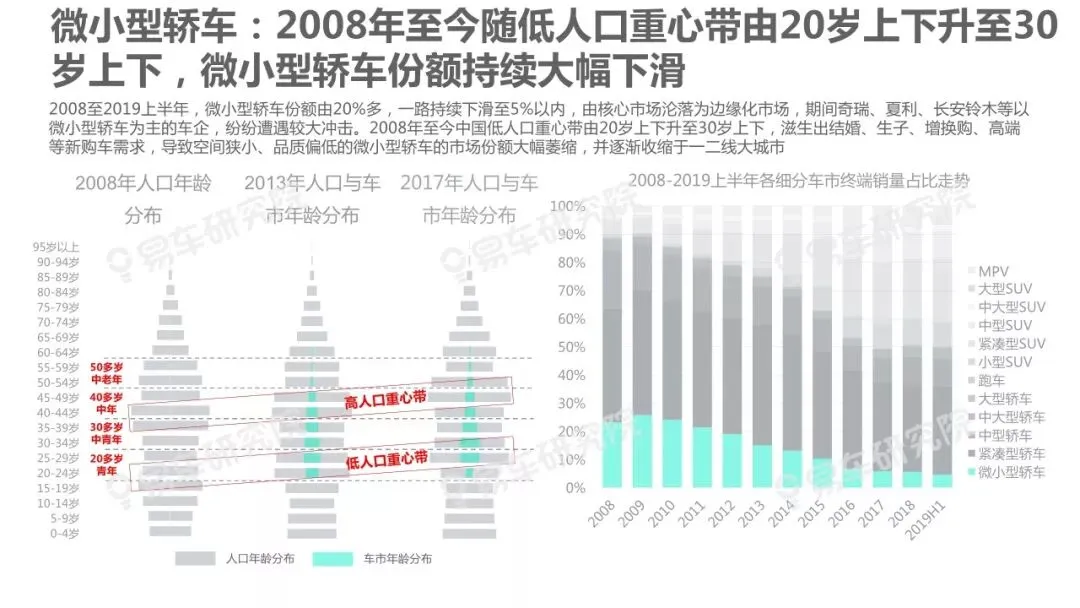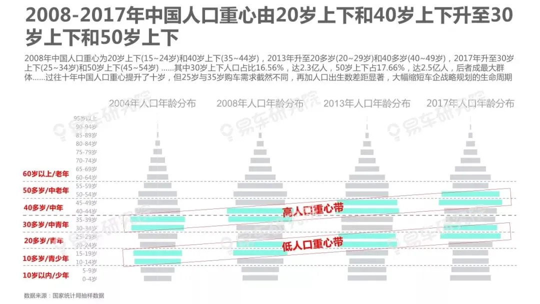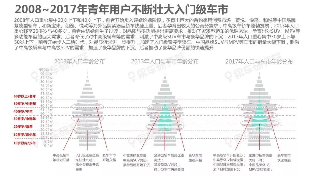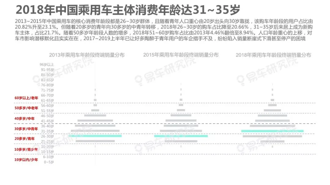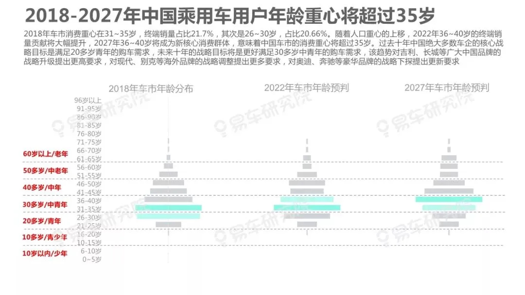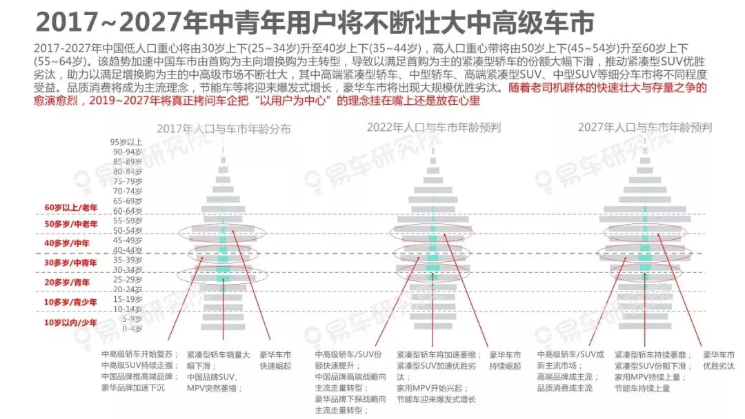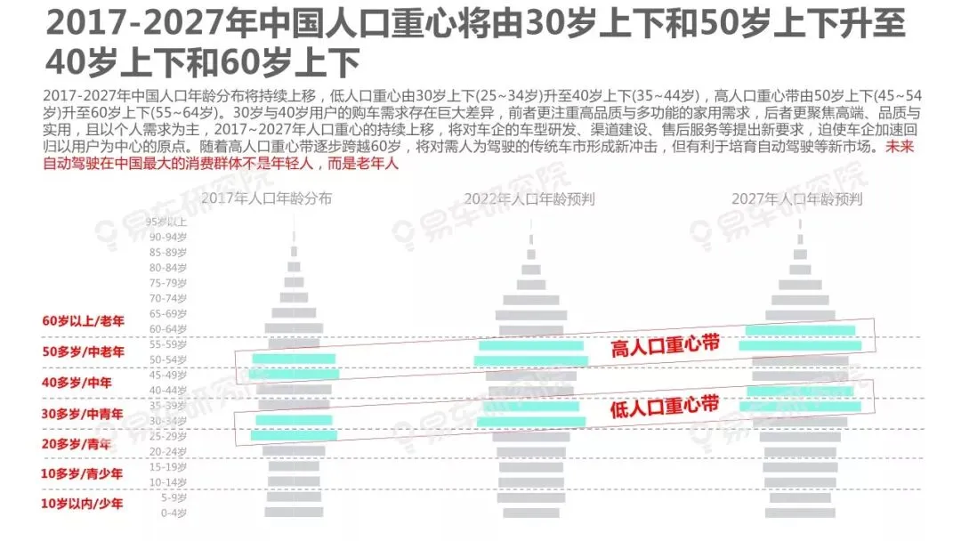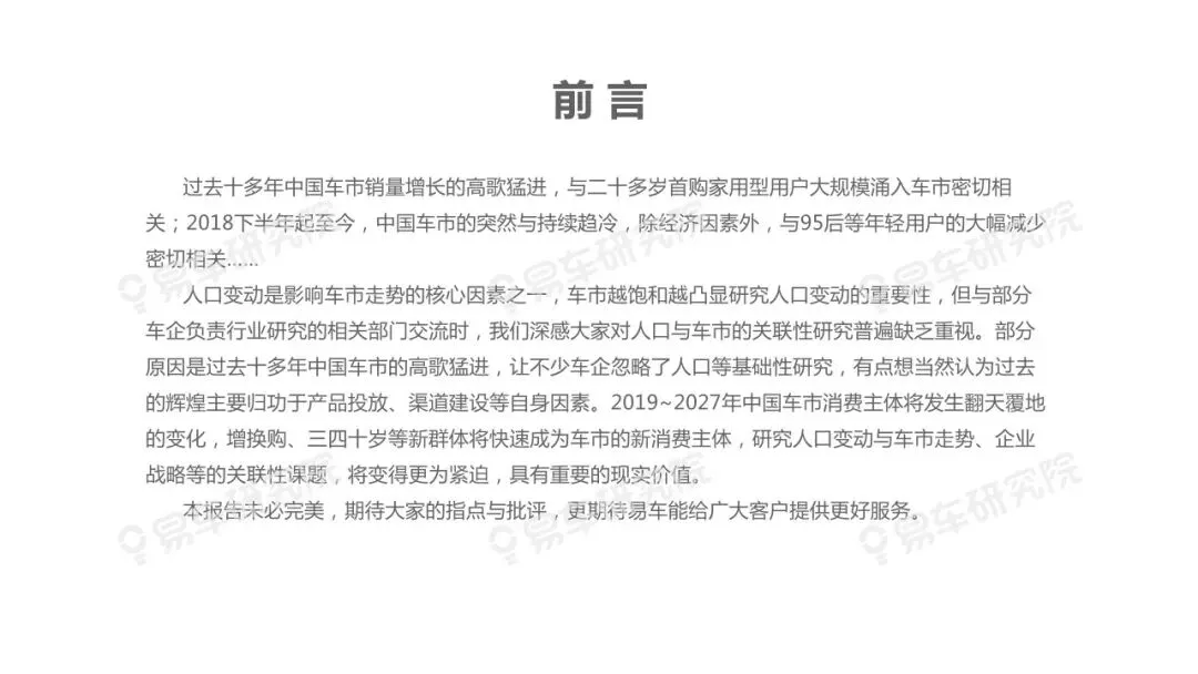 人口变动是影响车市走势的核心因素之一,车市越饱和越凸显研究人口变动的重要性,但与部分车企负责行业研究的相关部门交流时,我们深感大家对人口与车市的关联性研究普遍缺乏重视。部分原因是过去十多年中国车市的高歌猛进,让不少车企忽略了人口等基础性研究,有点想当然认为过去的辉煌主要归功于产品投放、渠道建设等自身因素。2019~2027年中国车市消费主体将发生翻天覆地的变化,增换购、三四十岁等新群体将快速成为车市的新消费主体,研究人口变动与车市走势、企业战略等的关联性课题,将变得更为紧迫,具有重要的现实价值。