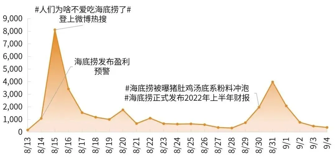 8月14日-9月4日,“海底捞发布上半年财报”事件相关舆情声量共计33,753篇,覆盖3,316家媒体。