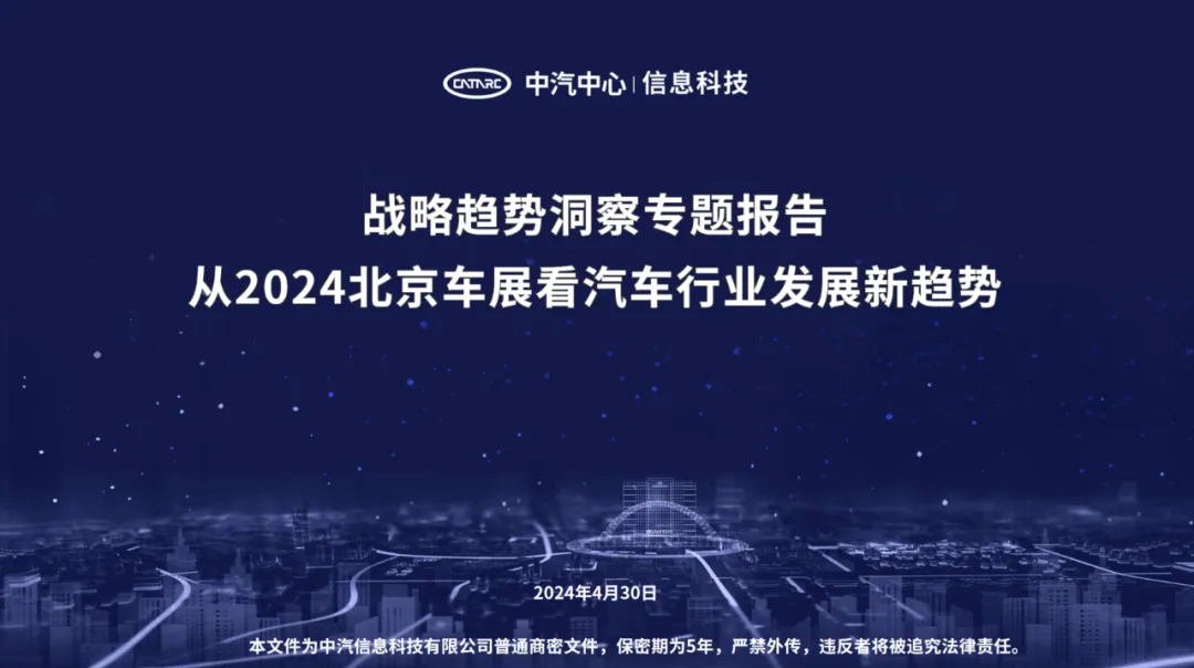 与以往车展不同,今年北京车展最大的看点是各位老总之间的寒暄互动以及直播流量。但不可否认,北京车展仍是汽车产业未来发展的“风向标”。本文重点分析北京车展期间在新品牌、新战略与新合作、新产品、新技术等方面的布局趋势。以下内容均来自于中汽信科战略研究工作组的《战略趋势洞察专题报告》2024年第4期。
