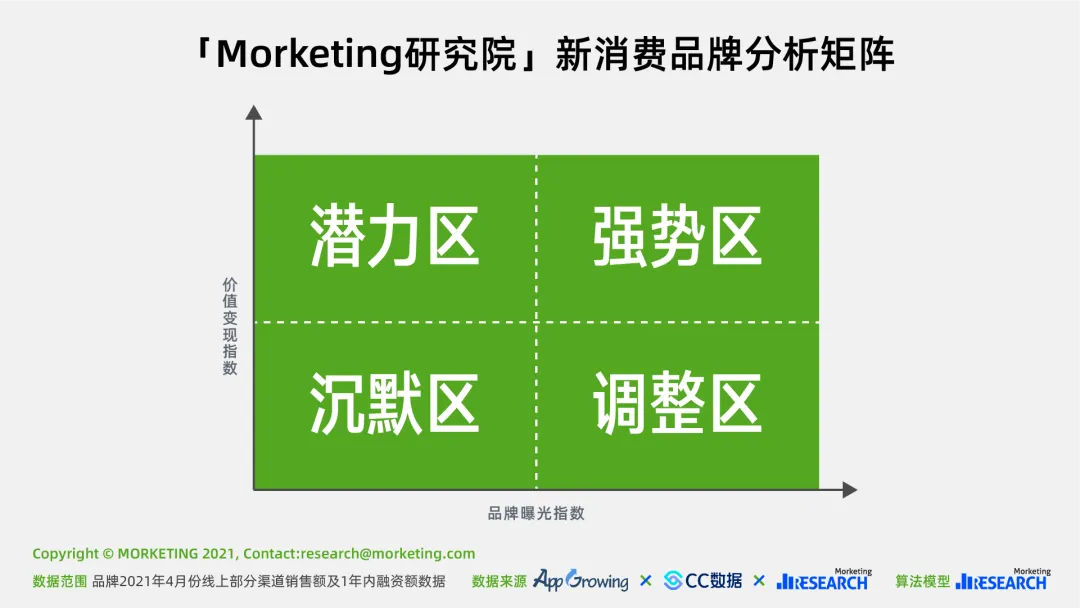 当前,新消费品牌构成大多以高速成长的新兴快消品类为主。参考成熟快消品牌与品牌营销行为的密切关系,「Morketing研究院」基于品牌的融资力度、部分线上渠道销量、媒体曝光指标等参数,设立了能够反映新消费品牌线上商业价值表现的矩阵图:该分析矩阵旨在体现在同一个评估体系下各品牌间的差距表现,已收录于「Morketing研究院」发布的《2020-2021新消费·新品牌》报告(点击文末“阅读原文”下载),并将持续进行月度更新。图中所示的四个不同细分矩阵,分别为潜力区、强势区、沉默区和调整区。各细分区域中的品牌则分别具有以下特征:- 强势区:拥有相对强势的商业价值变现能力和品牌曝光水平;
