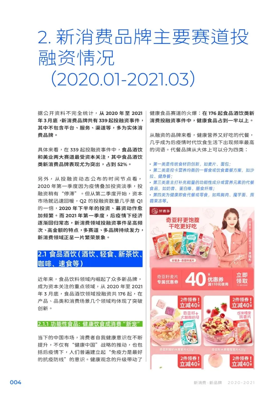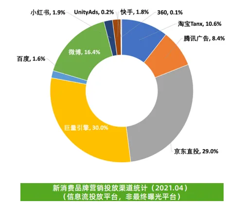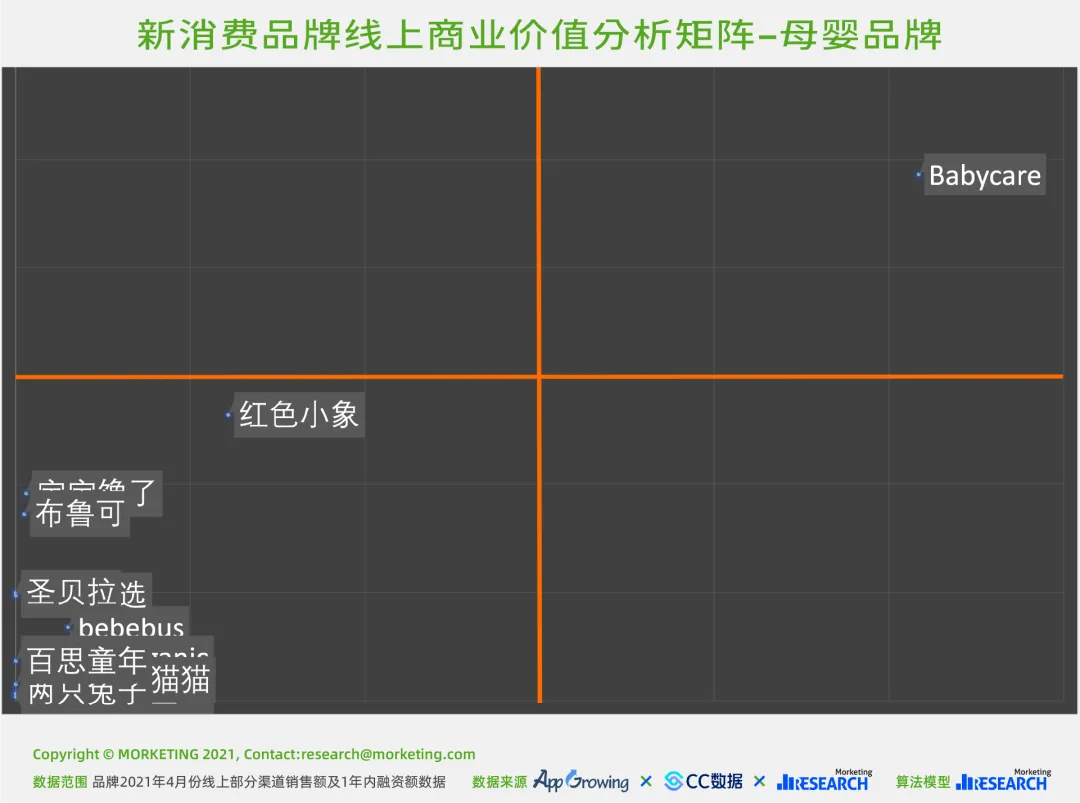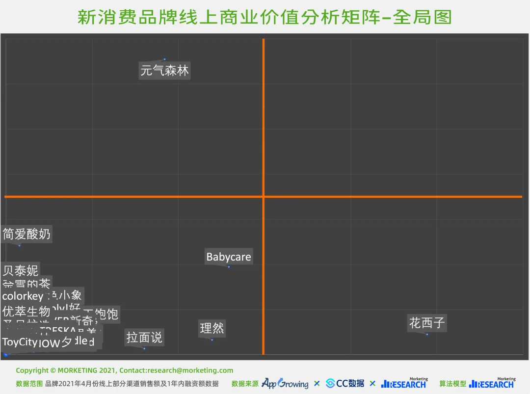 在「Morketing研究院」发布“新消费品牌线上商业价值分析矩阵”(2021.04版本)中,品牌统计范围为2020年1月-2021年3月期间获得任意轮融资的、主要提供实体产品(非服务类)的中国新消费品牌,其中不含上市公司,且必须包含线上(电商)购买渠道的相关品牌。新消费品牌线上商业价值分析矩阵-全局图(2021.04)从全局情况来看,目前绝大多数新消费品牌仍处于早期阶段,相比强势品牌差距较大。Babycare在整个新消费品牌范围内拥有远超大多数品牌的表现,元气森林、简爱酸奶商业价值变现能力突出,而花西子拥有最为强势的品牌曝光能力。新消费品牌线上商业价值分析矩阵-健康食品品牌(2021.04)王饱饱在 2021 年 4 月拥有相对强势的品牌曝光能力,但价值变现能力相对后置,在后续可以继续观察其动态走向;简爱酸奶则拥有相对强势的商业价值变现能力,但目前品牌曝光能力偏弱;其余健康食品品牌中,好麦多自 4 月起陆续展开一系列的品牌投放行为,并在进入 5 月份之后加大了投放力度,后续也将在矩阵图中有所体现;新消费品牌线上商业价值分析矩阵-酒类品牌(2021.04)酒类品牌中,泰山啤酒在 2020 年正式启动直营模式后,短期内的品牌曝光能力虽稍弱于观云品牌,但凭借多年的品牌积累,以及短期内的高额融资,目前处于相对强势位置;同时,元气森林于近期入股的碧山啤酒虽短期内还处于“沉默区”,但其未来表现仍值得关注;2021年4月底,观云在抖音平台密集启动了一系列品牌曝光投放,此举在矩阵图中也有所体现,目前拥有相对最为强势的曝光能力;新消费品牌线上商业价值分析矩阵-饮料品牌(2021.04)饮料品牌品类中(包括瓶装饮料及袋泡茶等新式茶饮品牌),元气森林目前拥有绝对强势地位;而喜小茶、茶小空虽然也拥有活跃的品牌曝光表现,但相对于元气森林来讲仍然较为弱势;奈雪的茶通过电商渠道销售袋泡茶等产品,目前拥有仅次于元气森林的价值变现能力;新消费品牌线上商业价值分析矩阵-咖啡品牌(2021.04)三顿半、永璞、隅田川、时萃 SECRE等精品速溶咖啡品牌持续爆发;其中,隅田川咖啡目前拥有最强的商业价值变现能力,但品牌曝光能力弱于三顿半、时萃SECRE;新消费品牌线上商业价值分析矩阵-方便食品/调味品品牌(2021.04)方便食品/调味品品类中,拉面说目前拥有相对最为强势的品牌曝光表现,王家渡食品、自嗨锅品牌目前处于第二梯队阵营;瓷面江湖、日日煮品牌目前商业价值变现能力最强,如能进一步强化品牌曝光表现,将有能力进入强势品牌区;新消费品牌线上商业价值分析矩阵-休闲食品品牌(2021.04)休闲食品中,轩妈食品品牌曝光能力最为强劲,后续期待会有更好的商业价值变现能力;每日黑巧、王小卤短期获得了出色的商业价值变现表现,但品牌曝光能力相对不足;在获得相对优势的商业价值变现能力后,a1零食研究所距离“强势品牌”仅差相应的品牌力建设;新消费品牌线上商业价值分析矩阵-美妆个护品牌(2021.04)花西子无疑是美妆个护品类中品牌曝光最为强势的品牌,同时在没有外部融资的前提下,也能拥有较好的商业价值变现能力;在短期内实现多轮融资的理然品牌目前仍在强势成长;贝泰妮、colorkey、MOODY分属不同细分领域,但拥有相对强势的商业价值变现能力;新消费品牌线上商业价值分析矩阵-母婴品牌(2021.04)新消费品牌中,母婴品类已出现强势品牌:Babycare,同时兼具最强商业价值变现能力和品牌曝光能力;红色小象相对更为接近“潜力区”,在出色商业价值变现能力的基础上,应当酌情提升品牌曝光表现;新消费品牌线上商业价值分析矩阵-服饰品牌(2021.04)盘子女人坊”作为高端汉服品牌“从壹”的母品牌,目前在服饰赛道中拥有相对较强势的品牌曝光表现;Ubras、Bananain 蕉内、bosie 伯喜均拥有相对强势的商业价值变现能力;新消费品牌线上商业价值分析矩阵-宠物品牌(2021.04)宠物用品类品牌在品牌曝光投入、商业价值变现规模上都不及其他品类,同时相当一部分为宠物服务类品牌;相对来看,在提供实体消费产品的宠物品牌中,Cature 小壳、未卡 VETRESKA、宠物家处于第一梯队,他们分别具备优秀的商业价值变现能力和品牌曝光效果;新消费品牌线上商业价值分析矩阵-小家电品牌(2021.04)小家电品牌融资普遍在千万元级别,而在电商平台销售情况最好的分别为由利及 diiib大白两个品牌;火鸡电器品牌曝光能力最为强势;追觅科技凭借近期的高额融资,拥有相对更强的商业价值变现能力,后续如果进行恰当的品牌曝光,有机会成为小家电品类的强势品牌。后续,「Morketing研究院」商业价值分析矩阵将保持定期更新,持续追踪新消费品牌的线上商业价值表现。2021年4月,「Morketing研究院」开展了针对18-35岁主流消费人群的新消费品牌消费者问卷调研,调研结果显示,抖音(77%)、小红书(63.5%)、天猫 /淘宝(53%)位列受访者接触新消费品牌渠道提及率前三位,此外,分别有51.9%、46.1%受访者表示从微博、微信中了解到新消费品牌。「Morketing研究院」新消费品牌消费者问卷调研(2021.04)而通过分析新消费品牌在2021年4月的品牌曝光数据,「Morketing研究院」发现当前新消费品牌热门投放平台依次为巨量引擎、京东直投、微博、淘宝tanx、腾讯广告;在巨量引擎投放的新消费品牌中,美妆个护类占比约为48.1%,其次为饮料品牌,占比约14.7%;在京东直投平台投放的新消费品牌中,母婴类品牌占比最高,