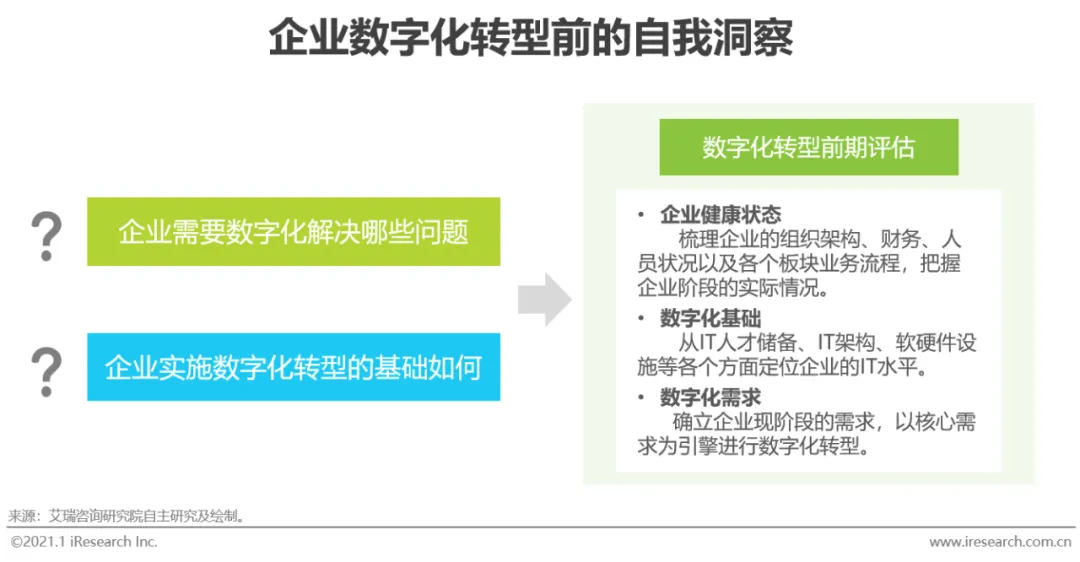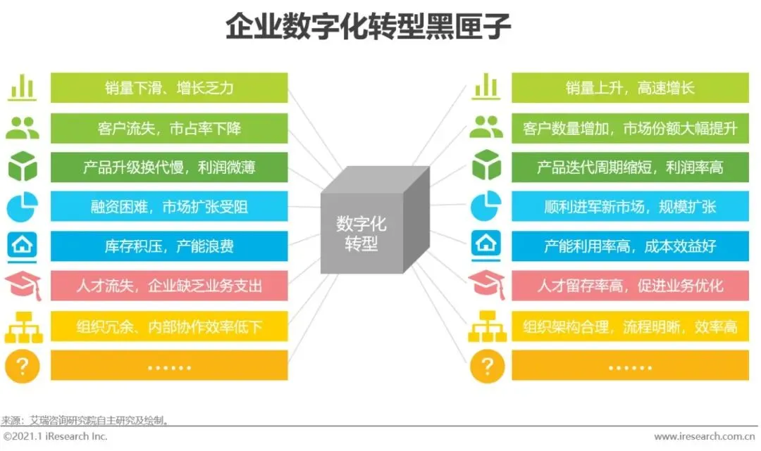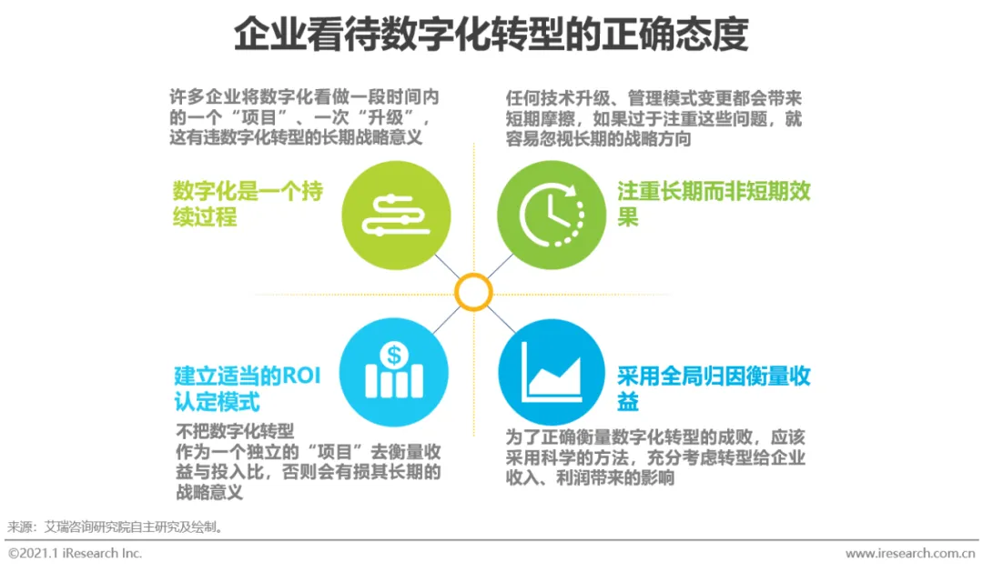 企业数字化转型集中问题:艾瑞通过实地调研发现,中国企业现阶段数字化转型失败的问题主要集中在两个方面:一部分只注重成果,希望数字化转型一站式地解决企业所有矛盾,却将前期自我洞察、产品选型、实施规划等环节“简单化”;另一部分则将数字化转型想象得过于“复杂化”,因而迟迟不愿意尝试和行动。
