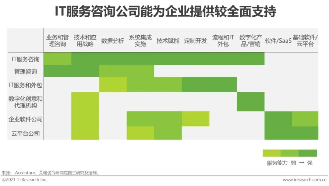 我国无论是企业还是个人消费者对于“无形产品”的购买意愿都较低,尽管我国政府不断加强对于IT知识产权的保护,许多企业还是更倾向于使用“免费”的盗版软件——更遑论加强对于付费咨询服务的投入。这也导致了中国的IT产业结构和全球平均水平相比,无论是软件还是服务(包括IT咨询)的占比都显著较低。国内IT市场经历了互联网经济和数字化转型浪潮多年的催化,发展成熟度大幅提高,在许多IT服务领域各家企业提供的产品已经呈现出较高的同质化趋势。在这一情况下,企业若想要在数字化转型过程中切实摸索出最适合自身的发展道路就不能忽视咨询和培训的价值,如果还秉持以前的观念,只看重产品本身的功能,而忽视了定制化咨询的作用,无异于是在IT投入中“买椟还珠”,这也是导致许多企业在进行高成本的技术投入之后认为数字化转型的效果未能达到期待的重要原因。