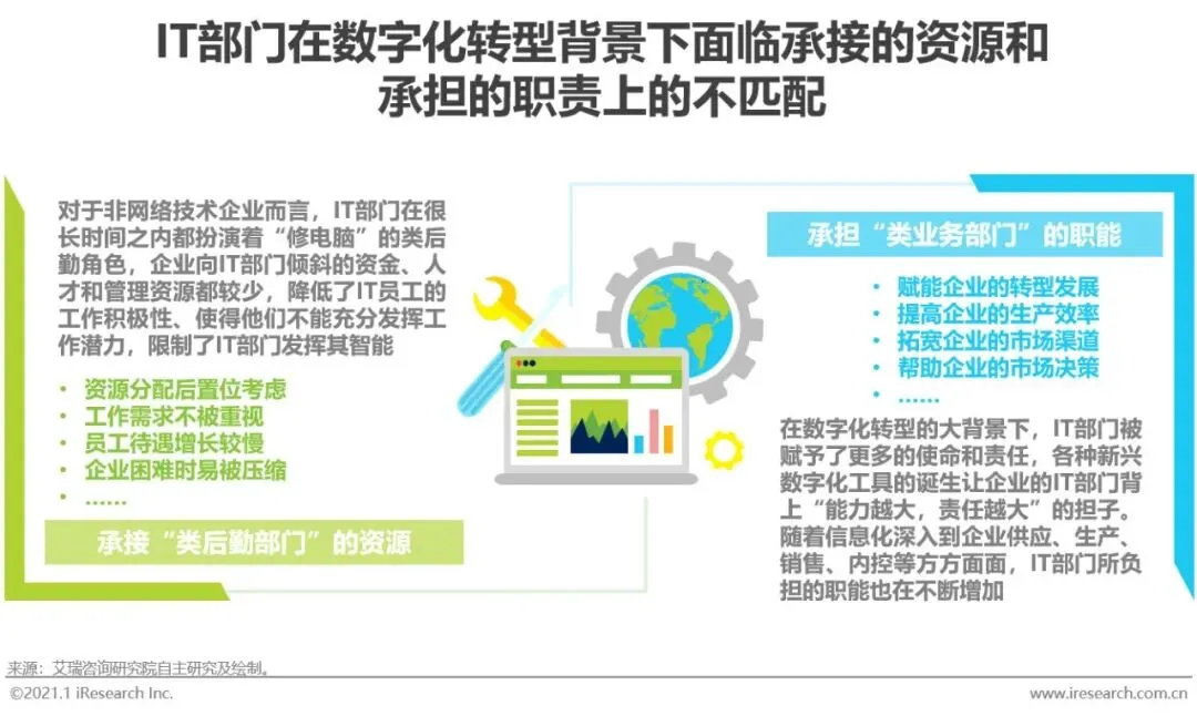 企业的IT部门一般而言是数字化转型的执行者,随着国内企业数字化趋势的确定性越来越高,无论是市场还是企业管理层都对IT部门能够交付的数字化答卷产生了很高的期待,分析行业常用“数字化赋能企业实现XXX”一类的表达来描述数字化的效能就是这一趋势的典型代表,这在客观上给企业的IT部门带来了更多的工作负载和压力,表现为IT部门的职能和考察越来越接近业务部门。然而,对于许多非网络技术企业而言,IT部门长期以来都被视作后勤部门,在企业战略布局中“人微言轻”,在日常工作中其资源需求和协同需求得不到充分的重视,并且在企业面临经营困难的时候往往首当其冲遭到压缩——这是前数字经济时代固有思维的遗存,墨守成规、对IT部门的战略位置不给予充分的重视会限制IT部门的职能发挥,从而压缩了企业融入数字化时代的机遇空间。