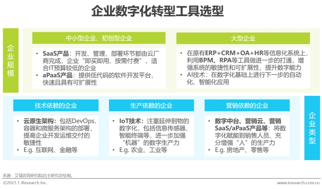 数字化是企业发展升级的必经之路,企业在决定进行数字化转型时需要选择适合自己发展情况和行业属性的工具。对于中小型企业和初创型企业,可以直接采用云部署、成本较低、快捷易用的SaaS和aPaaS产品,几十人的团队一年往往只需要几千到几万的价格和较短的部署时间,是开启数字化的低门槛之选;对于已经具备一定信息化基础的大型企业,可以在原先的ERP、CRM、OA、HR系统上做进一步的打通和改进,增强企业数字化能力。另外,对于具备不同行业性质的企业,可以根据其核心需求,有的放矢地部署云原生架构、IoT技术和数字中台等。