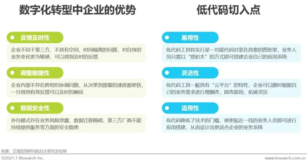 尽管外包市场逐步走向成熟,多种多样的第三方机构可以为企业数字化转型提供全链路的服务,但是企业作为转型的主体,需要进一步加强自己的自主性。外包模式在企业IT力量不足、专业人才缺失、投入资金有限、数字化转型经验缺失的条件下,是最优的解决方案。但是不容忽视的是,第三方天然存在“反馈不及时、调整不敏捷和安全隐患”的问题。首先理解企业的业务、梳理流程都需要一定的时间;同时受限于空间隔离和有限周期,第三方在感知业务变化和反馈方面会存在一定的时间差,在敏捷性和及时性方面较弱;另外信息安全和数据迁移方面也存在在一定的隐患。因此,企业在数字化转型的过程中,尤其是后期,需要提升自己的自主性,不能完全依靠第三方厂商。对于IT力量较为薄弱的企业,“低代码”提供了相应的解决方案。它将代码可视化,使业务人员通过拖拉拽的方式即可搭建企业自己的数字系统,而且在之后的过程中随时可以根据自身的变化进行更新。对于数字能力薄弱的中小型企业可以从此入手,逐渐升级自己的IT力量。