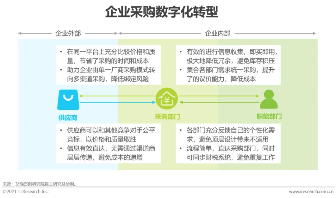 除了获客增收的核心需求外,采购涉及到公司的成本支出,是公司发展又一核心关注点。采购部门对外连接供应商,对内连接各职能部门,是企业供应链的管理核心。采购部门遇到的难点往往在于信息不对称。对外采购部门需要花费大量的时间与供应商、渠道商、分销商等等环节打交道来收集信息,还要考虑与单一厂商绑定的风险;对内采购部门往往难以及时得到各部门的需求反馈,为保证大批量采购压价往往牺牲了部分的适用性。而数字化以其特有的“链接”优势,帮助采购部门打通供应商和企业内部,同时还提供“分析和预测”功能,进一步帮助企业降低采购成本。