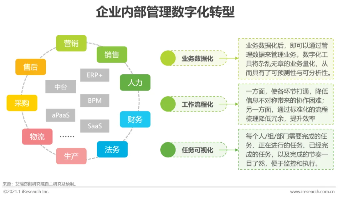 管理数字化即利用数字化相关技术和工具,将企业的业务量化后,通过管理数字进行内部管理。它将企业内的各个部门、组织都联系起来,改变了传统的组织工作形式,打破了企业内部的“数据孤岛”,使各部门实现真正地“协同”办公。在数字化的企业里,端到端的流程极大程度地降低了工作的冗余,可以在整体上减少工作时间。同时,数字化工具还可以将数据进一步可视化,每个人/部门都可以通过仪表盘看到自己的正在进行和未来规划的任务,进行即时的进行监控和分析,有助于员工进一步掌控工作节奏,提高工作效率。