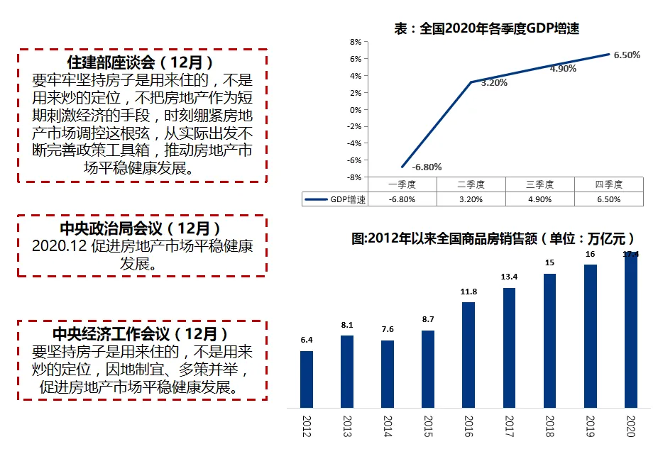 2020年初,受新型冠状肺炎疫情影响,我国经济、房地产行业均遭到了短期的打击,房地产销售呈现断崖式下跌。二季度以来,随着疫情得到有效控制,以及货币供应量的充足,对我国经济、房地产市场复苏形成了强大的支撑。目前宏观政策方面,房地产坚持房住不炒主基调不变,房地产金融监管收紧,未来将更加注重防范化解金融风险。未来,房地产行业可持续、高质量发展成为行业共识。