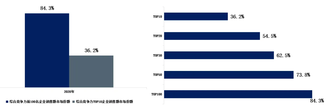 从市场份额来看,入围房企业绩贡献高企,是广东省房地产销售业绩贡献的主力军。2020年入围房企总销售额达1.9万亿,占广东省全年商品房销售额的84.3%,市场集中度高企。