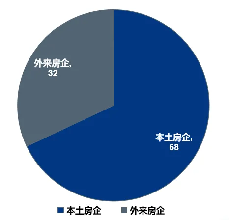 从入围企业属地看,本土房企占比近七成。入围房企中,总部所在地位居广东省的房企数量占据68席,外来房企占据32席,本土房企优势显著。
