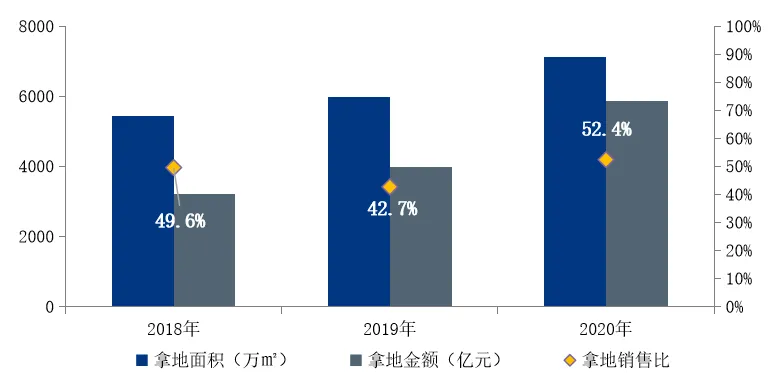 从入围代表企业拿地来看,2020年在广东省内通过招拍挂市场的拿地金额5850.2亿元,同比增加46.6%;拿地金额占销售额比重均值达到52.4%,与去年同期相比增长9.7个百分点,拿地积极性明显回升。