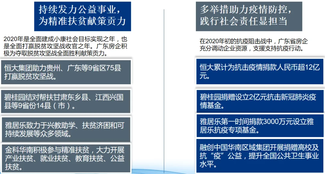 广东省房企在实现快速发展的同时,不忘积极履行企业公民责任。一方面,广东省房企努力克服新冠肺炎疫情带来的不利影响,为夺取脱贫攻坚战全面胜利献策贡力。另一方面,在2020年初的抗疫阻击战中,广东房企充分调动企业资源,支援支持抗疫行动。