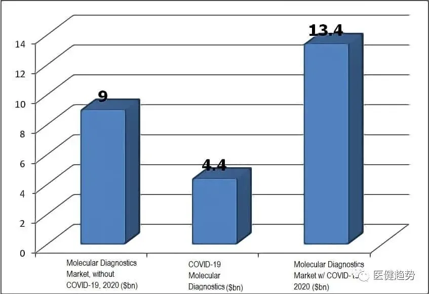 2、根据今年8月最新发布的Kalorama分子诊断市场相关的报告指出,原本估计2020年分子诊断市场规模约为90亿美元,受新冠病毒影响,市场规模预计突破134亿美金(折合人民币近千亿),去年同期发布的《全球第八版分子诊断报告》中原本预计到2024年将增长到129.55亿美元。这意味着今年分子检测的收入增长几已经达到2025年的同期水平