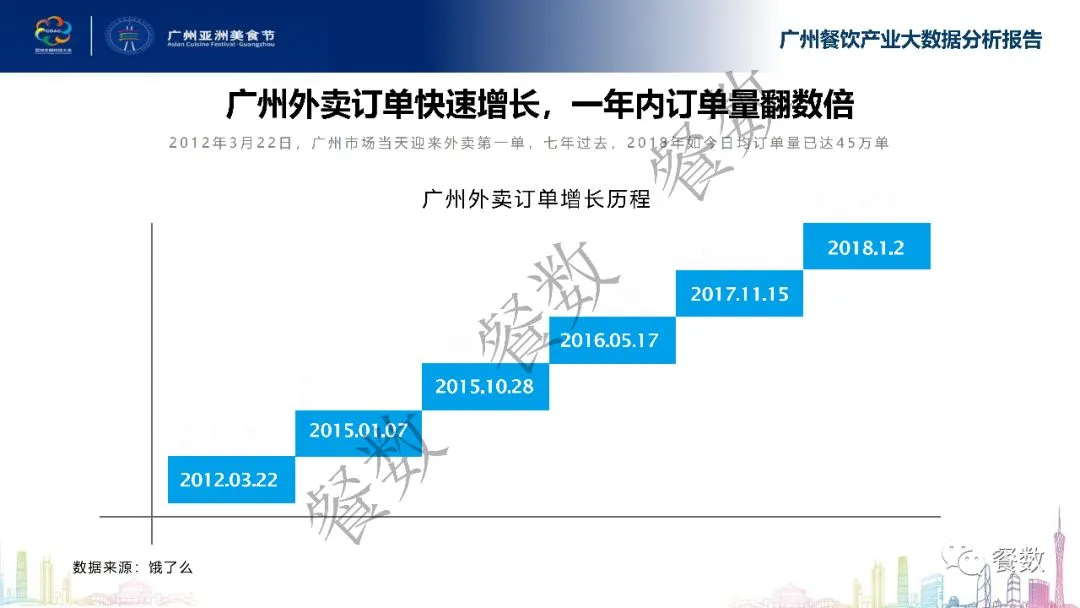 2012年3月22日,广州市场当天迎来外卖第一单,七年过去,2018年如今日均订单量已达45万单。