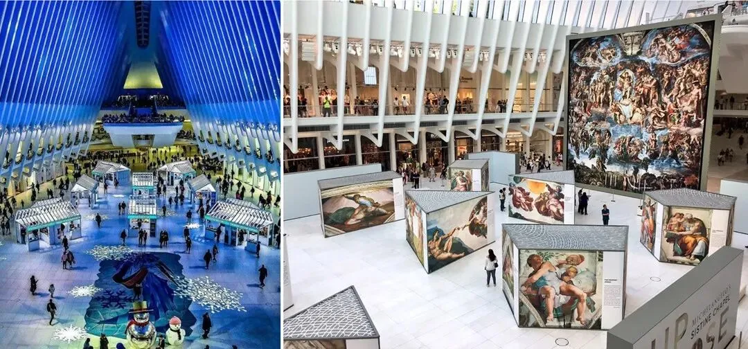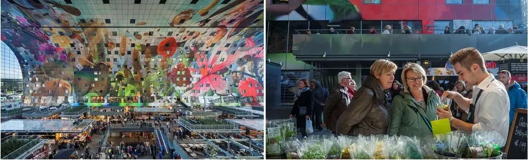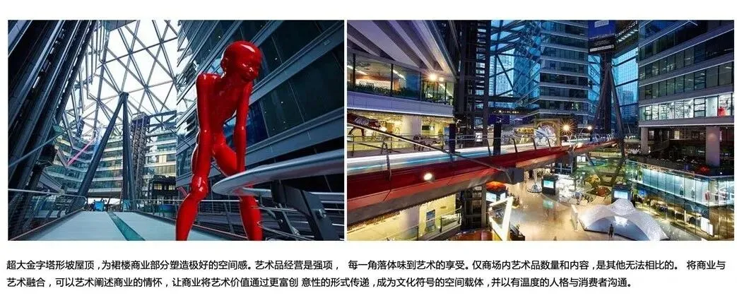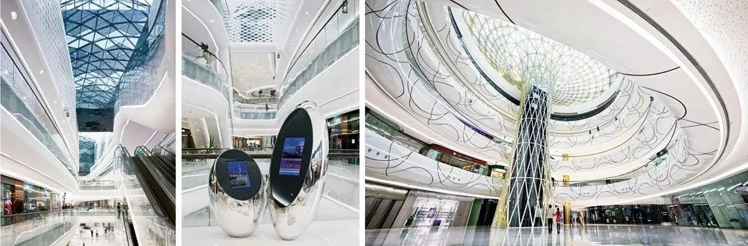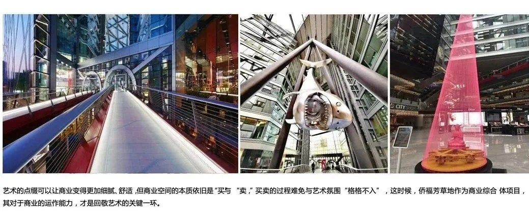 西田世茂的购物中心是一个地标的建筑,整个建筑是鸽子的形态,四周是商业,中间是可以作为展览、展示的复合空间。整个建筑会预留很多的空间来展示、展览、演出。也就是在新的建筑商业空间中,注入新的、更多的业态和理念。西田购物中心,不仅仅是在卖零售的商品,还可以在周末的时候进行秀场的演出,音乐会,儿童乐园,包括美食空间,休息的场所。重庆大悦城,在设计过程中,试图通过实践与论证,不断地和客户互动,创造一个新的零售商业空间。这个项目在渝北,建筑接近15万平方,东西向,高差40多平米,景观是由深圳一家优秀的公司完成的。通过室内外的关系创造景观和建筑的关系,把整个建筑通过一个大的长廊,创造以峡谷为原型,形成一个独特的、接近七八十米长的管廊,让空间变得更加的休闲,集文化、艺术、关注儿童等各方面进行探索,当然也有传统的业态。荷兰的一个菜市场,四周是住宅,中间是菜市场,这个建筑完成之后形成了多元的复合商业空间,每年创造1500万的客流量。通过景观、艺术、科技、文学、戏剧、动漫、影视、游戏等等,甚至请明星的建筑事务所来共同参与,形成新的IP。或者说和消费者一起来互动,产生IP内容注入到商业空间中。未来强化不同的主题特色,体现独特体验的强主题设计理念的场所,是值得我们思考和探索的。2012年北京的侨福芳草地,这是一个老项目,通过以艺术与商业之间的平衡和结合,完成对商业空间的设计,是中国的商业空间在艺术实践中的一个先行者,直到现在这个项目都非常好。