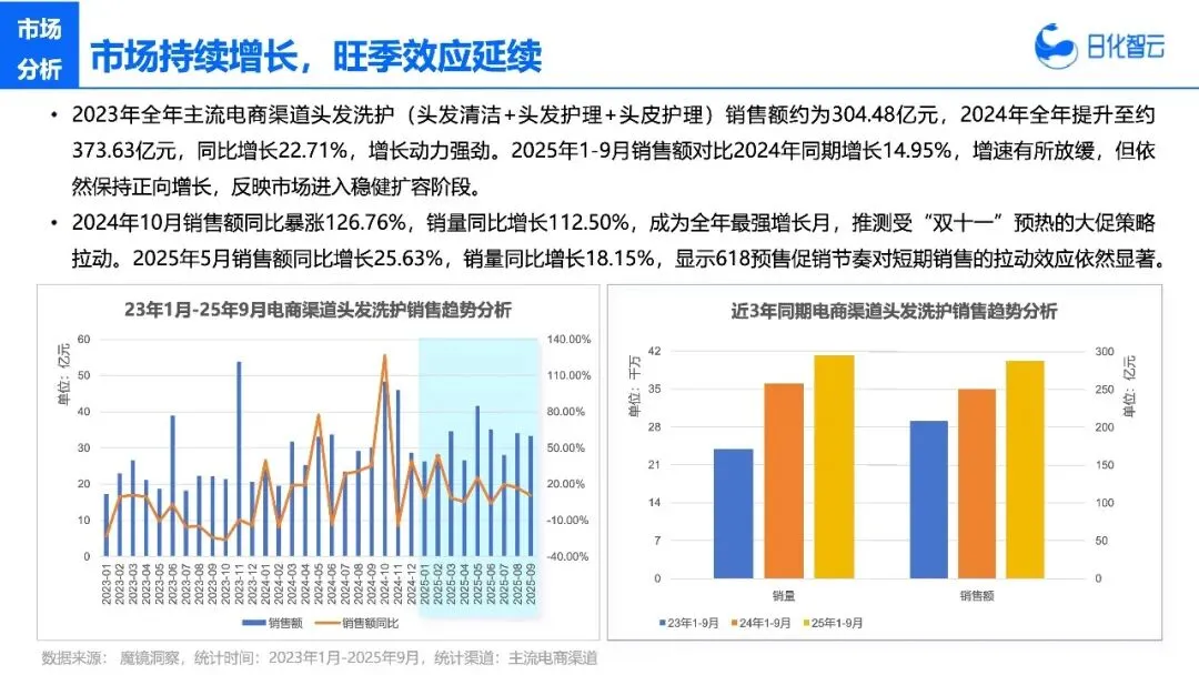 头发洗护市场的“大蛋糕”还在变大,2025年1-9月整体销售额同比增长14.95%,但增长的核心已经从“头发护理”转向“头皮护理”。未来能活下来、活得好的品牌,不是那些只会降价内卷的,而是能精准抓住“头皮健康”这个核心需求,并且摸透不同渠道用户心智的。
