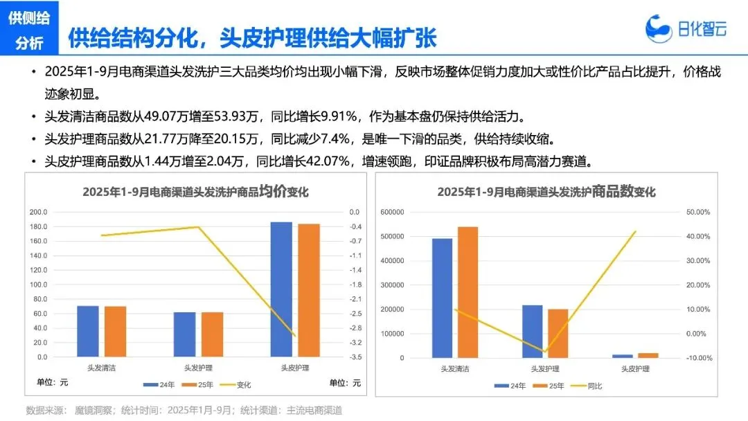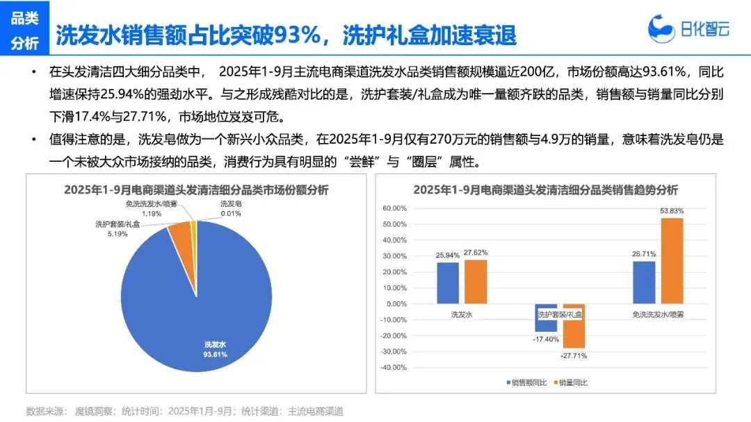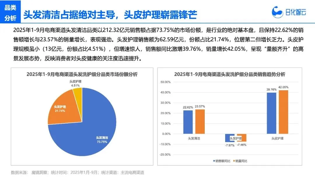 先给大家抛个最直观的矛盾数据:2025年1-9月,头发护理品类销售额同比下滑7.97%,销量也跌了7.46%;而头皮护理品类,销售额同比暴涨39.76%,销量增速更是达到42.05%。