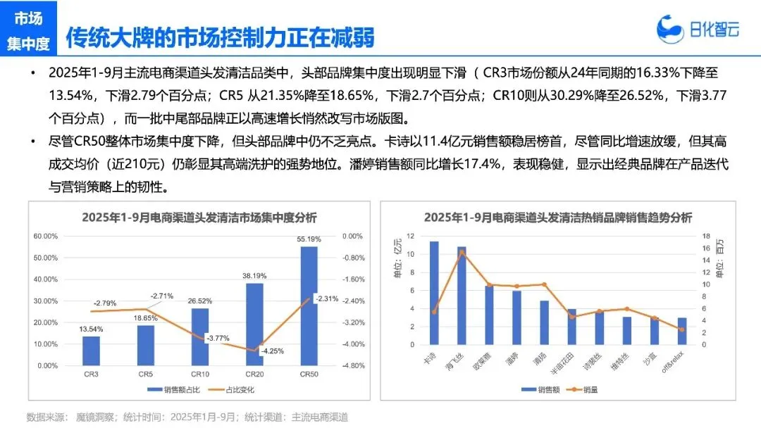 说到这里,可能有人会问:现在入局头皮护理还来得及吗?从数据上看,机会还在。2025年1-9月,头皮护理市场CR10只有48.46%,比去年还下降了2.14个百分点,说明市场格局还没稳定,中腰部品牌还有突围机会。而且消费者的需求还在细化,除了防脱,头皮控油、敏感肌头皮护理这些细分方向,都有增长空间。