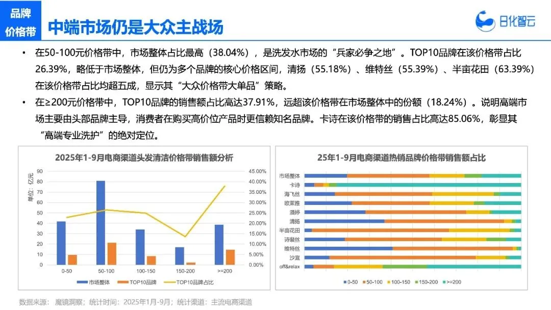 这里面藏着两个关键信号:一是高增速背后是真实需求,不是资本炒作。2023年头皮护理销售额才12.03亿元,2024年就涨到15.01亿元,2025年前9个月就快追上2023年全年了,这种连续三年的增长,不可能是短期营销带来的;二是消费升级趋势明显,400元以上价格带占比38.4%,而且头部品牌在这个价格带的销售额占比高达61.53%。