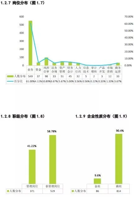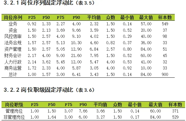 考量薪资水平的另一个因素是薪资结构,主要看固定薪资跟浮动薪资的比率(简称固浮比),即工资跟奖金的比率。有900个租赁人参与该部分调研,调查显示,业务岗,资金岗,风控信审岗及财务会计岗位的薪酬固浮比主要集中在1.5:1,并且管理岗位与非管理岗位的薪酬固浮比也主要集中在1.5:1,请参考表3.5-3.6。