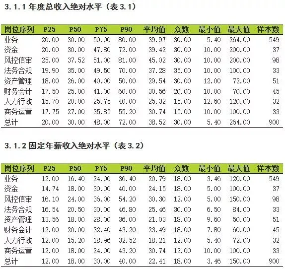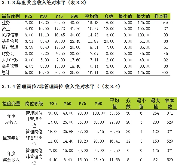 就薪资绝对水平而言,有900个租赁人参与该部分调研,调查显示,2017年,融资租赁行业年度总收入平均值为38.52万,其中管理岗为53.55万;固定年薪收入平均值为22.41万,其中管理岗为30.96万;年度奖金收入平均值为16.11万,其中管理岗为22.6万,具体到每个岗位,请参考表3.1-3.4。