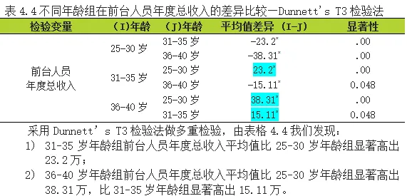由表4.3可得出,就年龄因素在“前台人员年度总收入”的差异比较而言,显著性P=0.000<0.05,已达到0.05显著水平 ,表示不同年龄组在“前台人员年度总收入”上有显著差异,至于是哪几对年龄组间的差异达到显著,需要进一步进行事后比较方能得知。