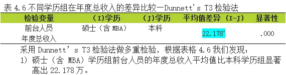 由表4.5可得出,就学历因素在“前台人员年度总收入”的差异比较而言,显著性P=0.000<0.05,已达到0.05显著水平 ,表示不同学历组在“前台人员年度总收入”上有显著差异存在,至于是哪几对学历组间的差异达到显著,需要进一步进行事后比较方能得知。