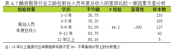 4.1.4 前台人员年度总收入在融资租赁行业工龄因素上的差异